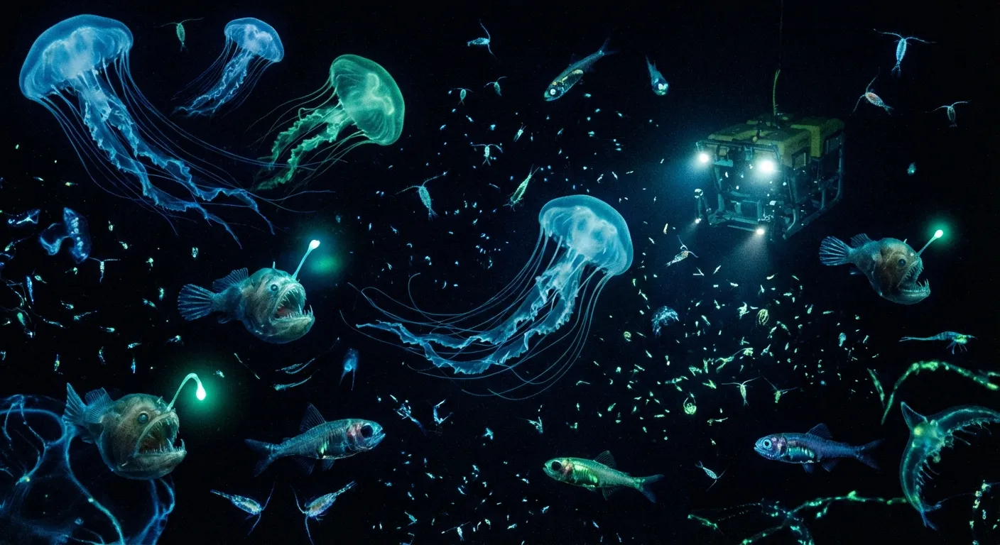 When external light sources disappear entirely, organisms that need to see, communicate, hunt, or attract mates face a fundamental problem. Evolution's solution was bioluminescence: the ability to produce light through chemical reactions within living tissue. The deep ocean is the most bioluminescent environment on Earth, with an estimated 90% of animals in the midnight zone capable of producing their own light, according to research by marine biologist Edith Widder of the Ocean Research and Conservation Association.