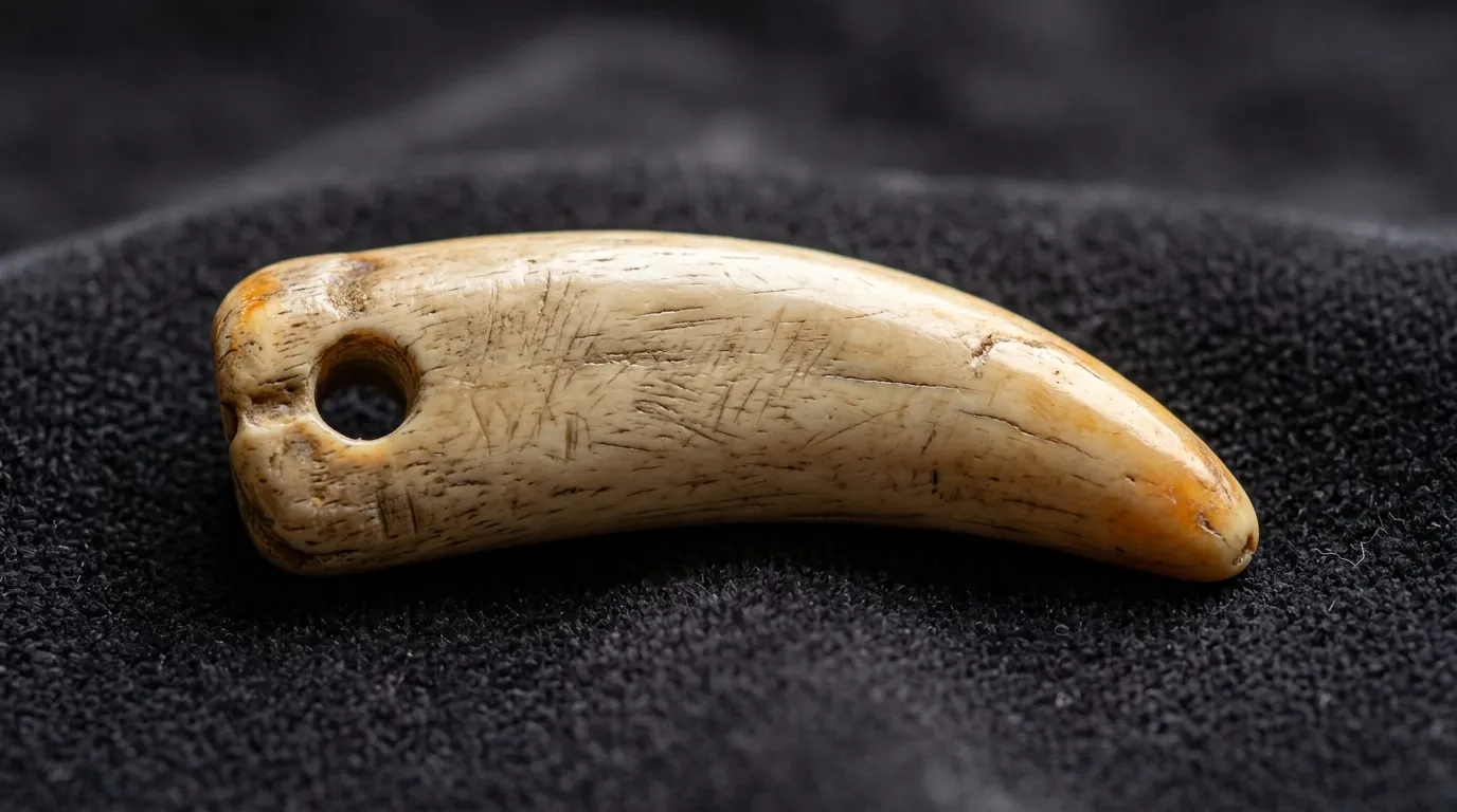 Finally, the team examined the pendant's surface under high-magnification microscopy. They documented evidence of systematic working: the root of the tooth had been scraped and ground to reduce its thickness, a hole had been drilled through the remaining root using a pointed flint tool rotated repeatedly from both sides, and the pendant showed clear polish consistent with long wear against skin or clothing. This was a finished object, used for an extended period, not a hastily made trinket.