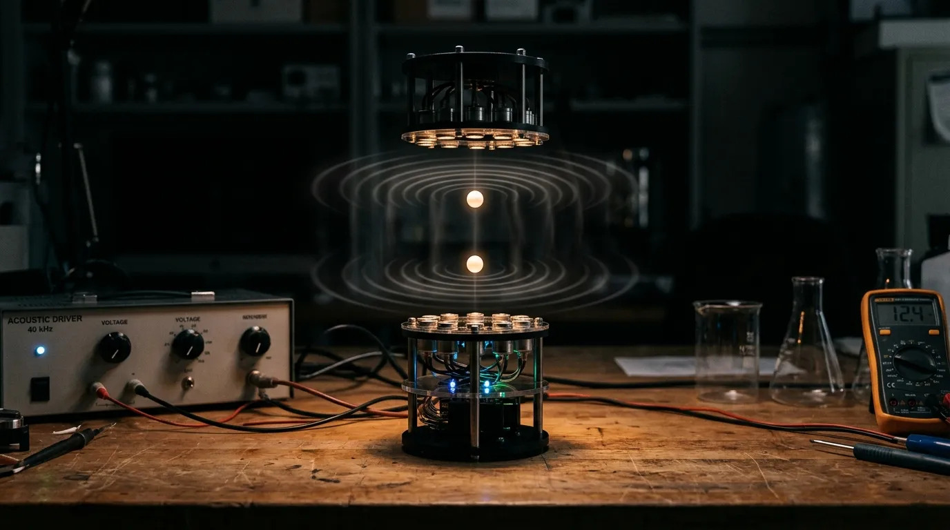 The NYU experiment, published in Physical Review Letters in February 2026, took a radically different approach. David Grier, a professor of physics and director of NYU's Center for Soft Matter Research, along with graduate student Mia Morrell and undergraduate Leela Elliott, built a device roughly one foot tall. A speaker array generates a standing sound wave powerful enough to suspend small objects against gravity. They placed two polystyrene beads, ordinary packing Styrofoam, about one to two millimeters in diameter, into the acoustic field.